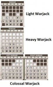 Dark grey boxes are ignored, white boxes are the warjack's outer armour layer, and the letters correspond to the warjack's systems. If you knock out all the same letters, that system becomes crippled and the warjack suffers these effects:
