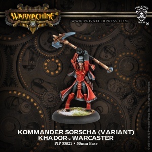 Kommander Sorscha Kratikoff wages unending war against the enemies of Khador. After the untimely death of her father, she lied about her age and joined the Winter Guard, rarely leaving the battlefield since. As cold and stoic and the frigid northland from which she hails, Sorcha is the embodiment of the Khadoran Empire, both in terms of fighting prowess and unshakable resolve.