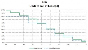 - Similarily, if you roll 2d6 twice in a row (to hit and to damage), the odds of getting 7+ twice in a row is: (approximately 60%) multipled by (approximately 60%) equals (approximately 36%).