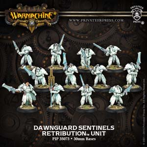 Casters like Ravyn, Eternal Light and Lord Arcanist Ossyan are geared heavily towards supporting Retribution's significant ranged options while Adeptis Rahn plays a strong positioning game and both Dawnlord Vyros and Vyros, Incissar of the Dawnguard heavily favor warjacks. Of special note is Issyria, Sibyl of Dawn, currently the only warcaster in the game with neither a weapon nor damage-dealing spell who instead lives off of a host of powerful support abilities that work well with almost any troops in the faction.