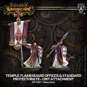Temple Flameguard are the cheapest troops in the Protectorate. Huddling together to stay safe, Shield Wall and Tough make them surprisingly resilient against shooting while Set Defense makes them able to take a charge.