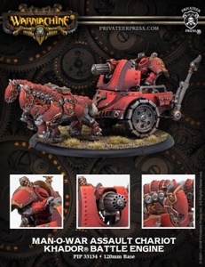 • Man-o-War Chariots are heavy weapon platforms drawn by pairs of Karpathans. Each of two variants is again dedicated towards dealing with specific types of threats, but unlike Tankers they can comfortably mix it up in melee they're both terrifying when charging. Chariots require a lot of finesse to be played well, and they're expensive miniatures so they don't see a lot of tabletops but both are very powerful pieces for experienced players.
